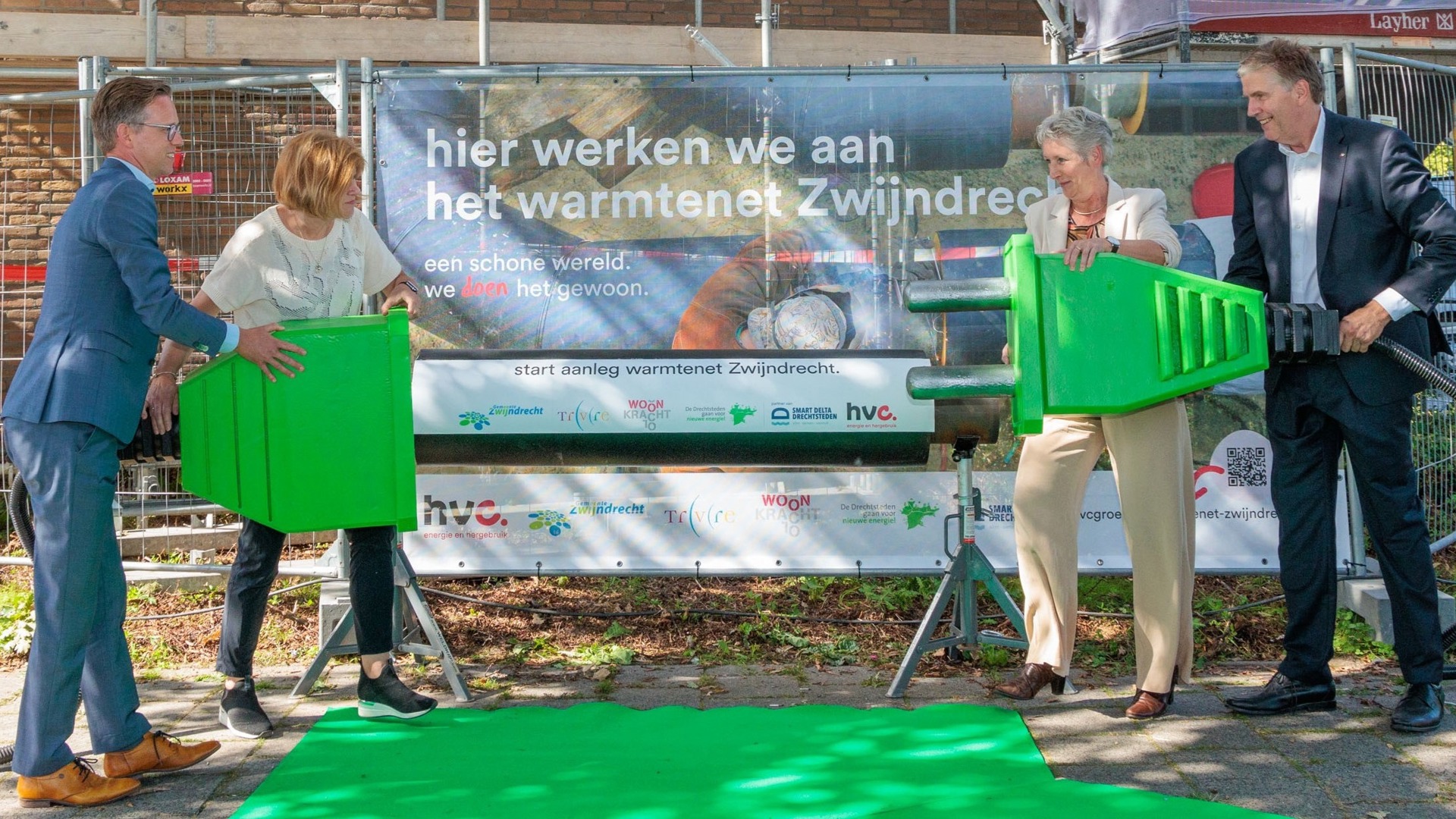 Op woensdag 23 augustus hebben het duurzame energie- en afvalbedrijf HVC, de woningcorporaties Trivire en Woonkracht10 en de gemeente het officiële startsein gegeven voor de aanleg van het warmtenet in Zwijndrecht. Door twee enorme stekkers met elkaar te verbinden, symboliseren de bestuurders de samenwerking. De eerste buizen gaan de grond in nabij de Kapiteinflats in de wijk Kort Ambacht.