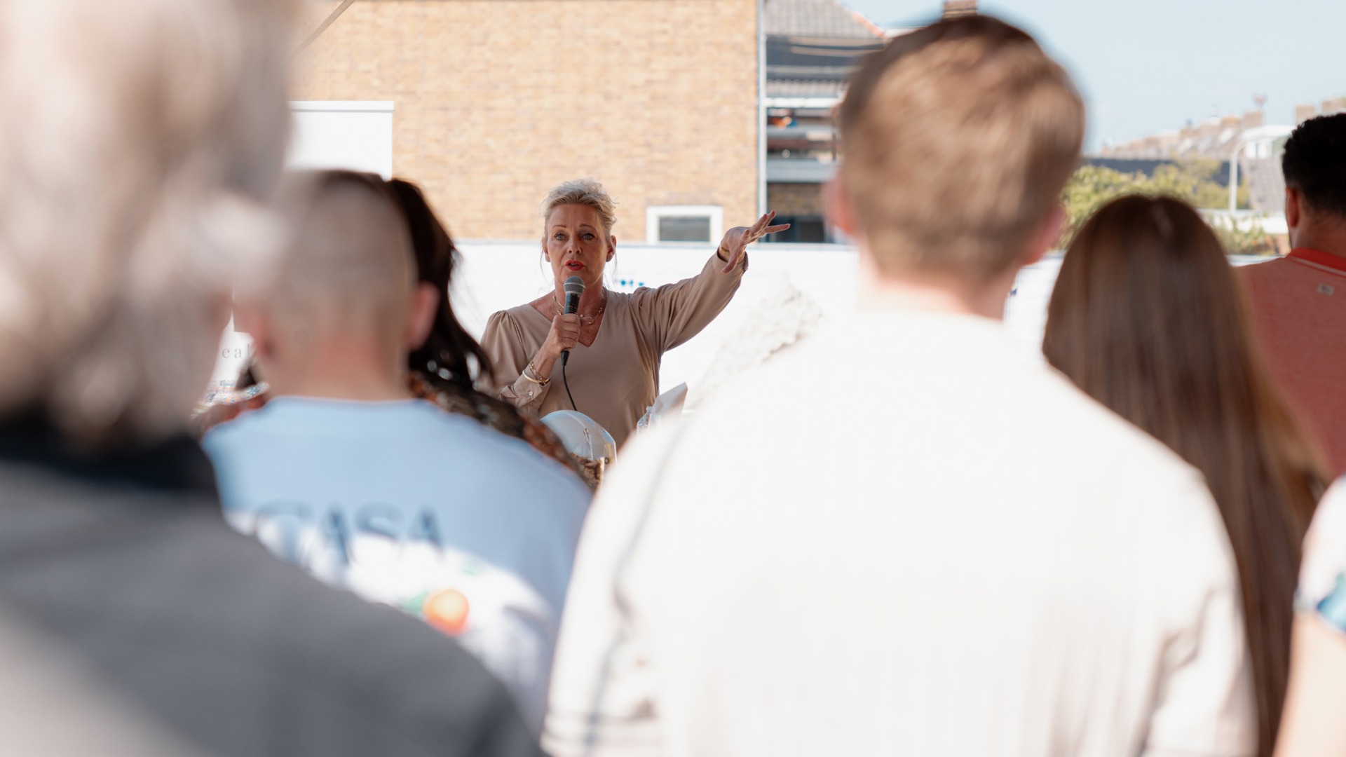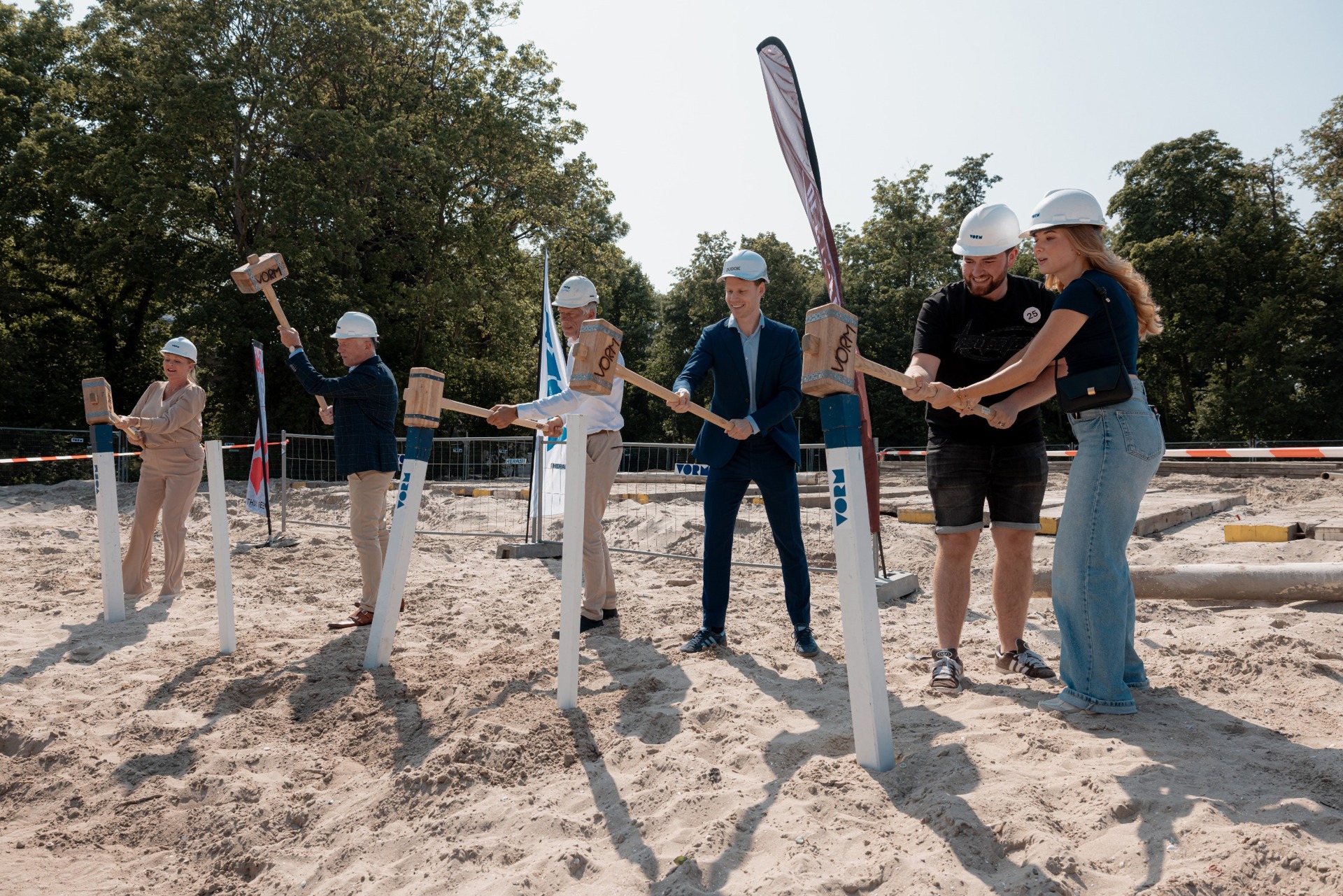 Tijdens de bijeenkomst sloegen Liesbeth Groeneveld (bestuurder Woonkracht10, links op de foto), Simon van Heck (projectontwikkelaar Dudok Real Estate), Ad van de Graaf (commercieel directeur VORM 6D Wonen), Freek de Gier (wethouder gemeente Alblasserdam) en twee toekomstige bewoners samen de symbolische eerste paal. Dit gebeurde onder toeziend oog van de samenwerkingspartners en toekomstige bewoners.